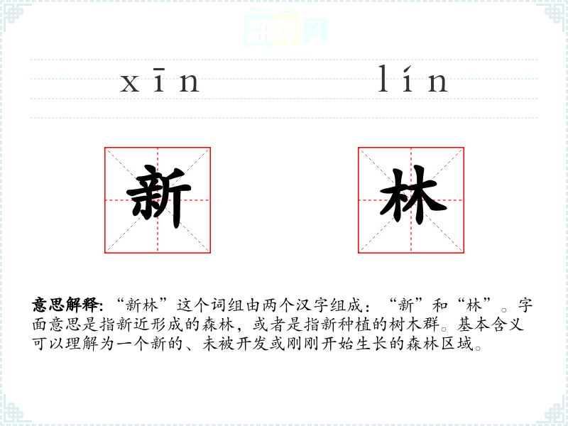 “新林”这个词组由两个汉字组成:“新”和“林”。字面意思是指新近形成的森林,或者是指新种植的树木群。基本含义可以理解为一个新的、未被开发或刚刚开始生长的森林区域。