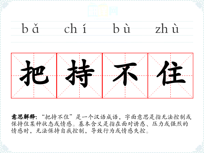 “把持不住”是一个汉语成语,字面意思是指无法控制或保持住某种状态或情感。基本含义是指在面对诱惑、压力或强烈的情感时,无法保持自我控制,导致行为或情感失控。