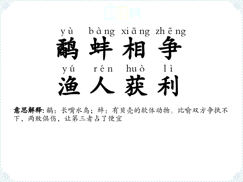 鹬:长嘴水鸟;蚌:有贝壳的软体动物。比喻双方争执不下,