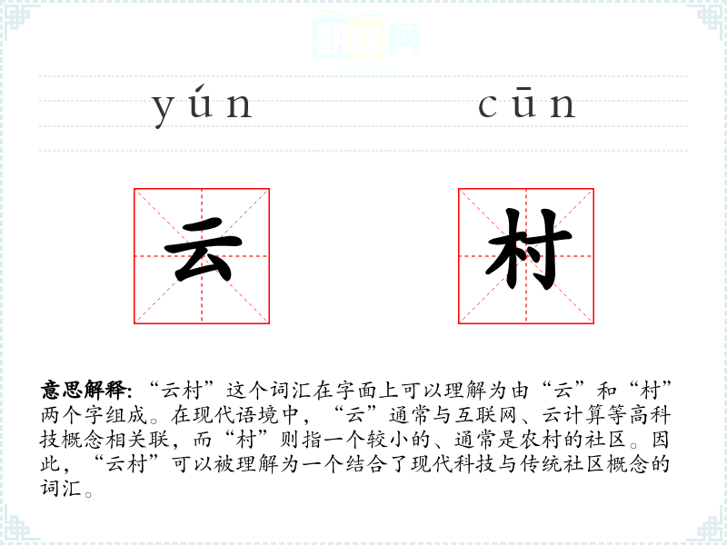 “云村”这个词汇在字面上可以理解为由“云”和“村”两个字组成。在现代语境中,“云”通常与互联网、云计算等高科技概念相关联,而“村”则指一个较小的、通常是农村的社区。因此,“云村”可以被理解为一个结合了现代科技与传统社区概念的词汇。