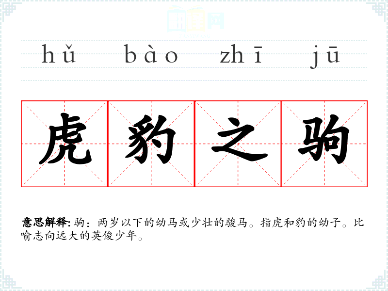 驹:两岁以下的幼马或少壮的骏马。指虎和豹的幼子。比喻志向远大的英俊少年。