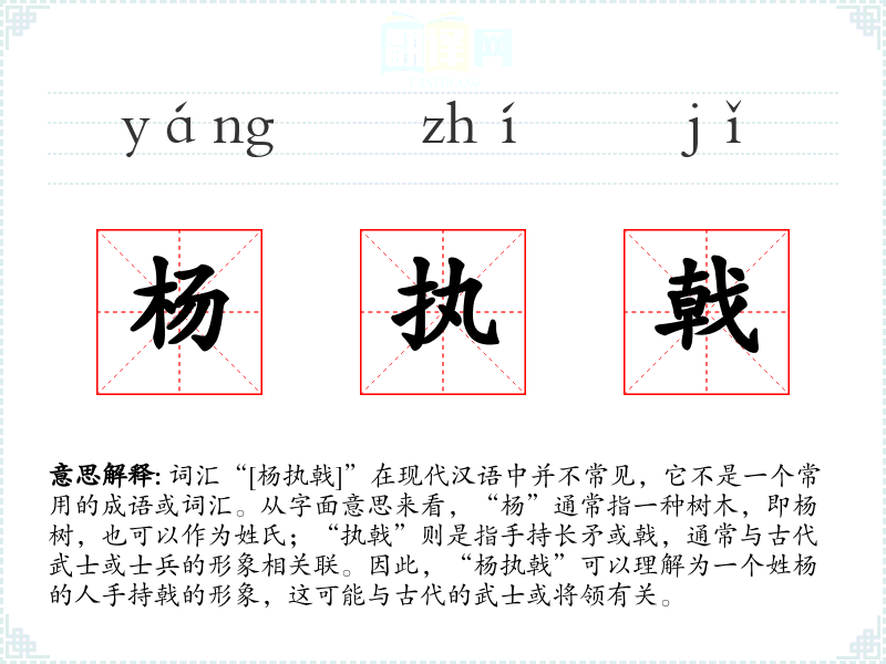 由于“杨执戟”不是一个常用词汇,其词源和历史演变不详。它可能是某个特定历史人物的名字或绰号,或者是文学作品中的虚构角色。