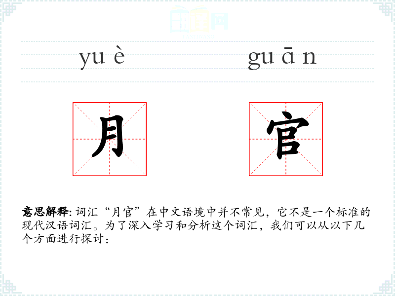 词汇“月官”在中文语境中并不常见,它不是一个标准的现代汉语词汇。为了深入学*和分析这个词汇,我们可以从以下几个方面进行探讨: