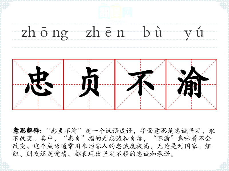 “忠贞不渝”是一个汉语成语,字面意思是忠诚坚定,永不改变。其中,“忠贞”指的是忠诚和贞洁,“不渝”意味着不会改变。这个成语通常用来形容人的忠诚度极高,无论是对国家、组织、朋友还是爱情,都表现出坚定不移的忠诚和承诺。