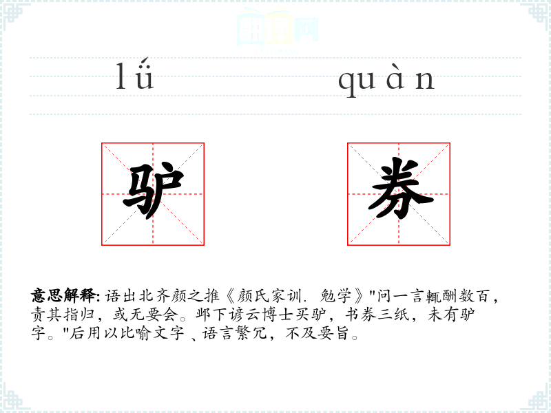 语出北齐颜之推《颜氏家训.勉学》"问一言輒酬数百,责其指归,或无要会。邺下谚云博士买驴,书券三纸,未有驴字。"后用以比喻文字﹑语言繁冗,不及要旨。