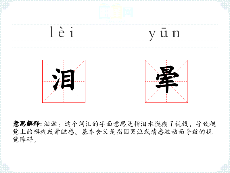 泪晕:这个词汇的字面意思是指泪水模糊了视线,导致视觉上的模糊或晕眩感。基本含义是指因哭泣或情感激动而导致的视觉障碍。