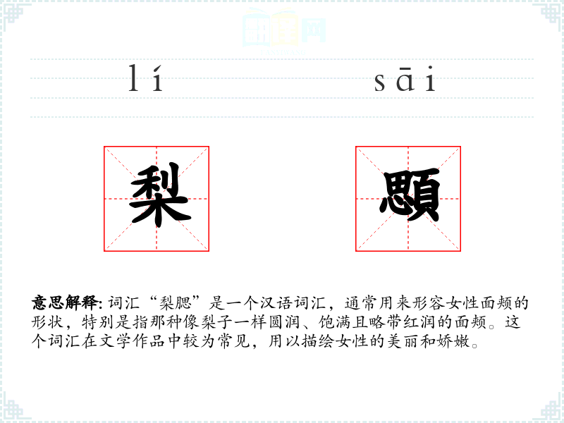 词汇“梨腮”是一个汉语词汇,通常用来形容女性面颊的形状,特别是指那种像梨子一样圆润、饱满且略带红润的面颊。这个词汇在文学作品中较为常见,用以描绘女性的美丽和娇嫩。