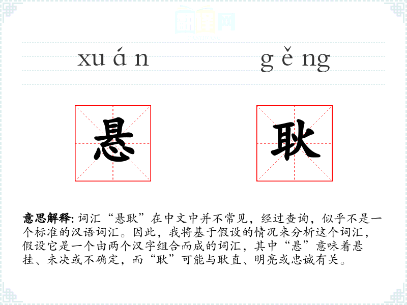 词汇“悬耿”在中文中并不常见,经过查询,似乎不是一个标准的汉语词汇。因此,我将基于假设的情况来分析这个词汇,假设它是一个由两个汉字组合而成的词汇,其中“悬”意味着悬挂、未决或不确定,而“耿”可能与耿直、明亮或忠诚有关。