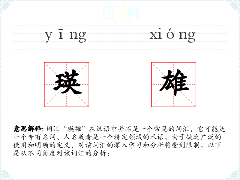 由于“瑛雄”不是一个标准词汇,我们无法提供一个确切的基本定义。它可能是由两个汉字组成的复合词,其中“瑛”可能指宝石的光泽或美丽的石头,而“雄”通常指男性、雄性或强大。
