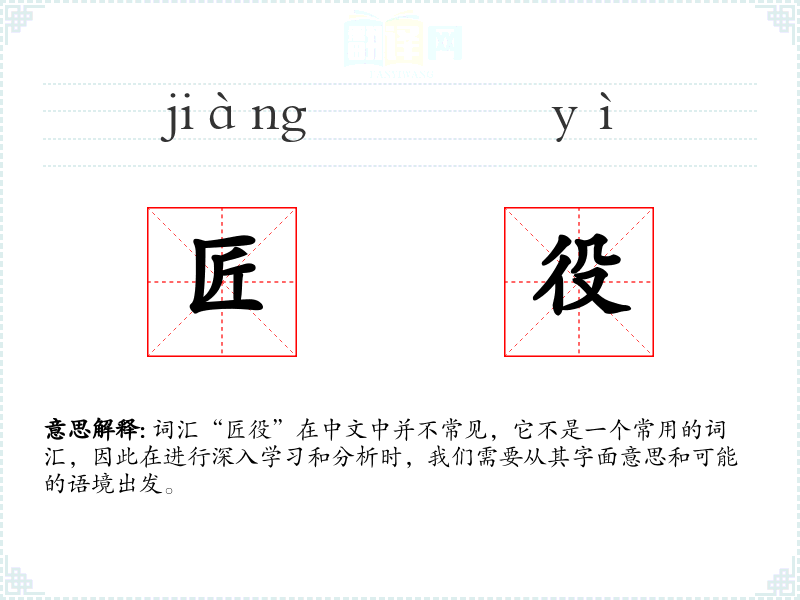 词汇“匠役”在中文中并不常见,它不是一个常用的词汇,因此在进行深入学*和分析时,我们需要从其字面意思和可能的语境出发。