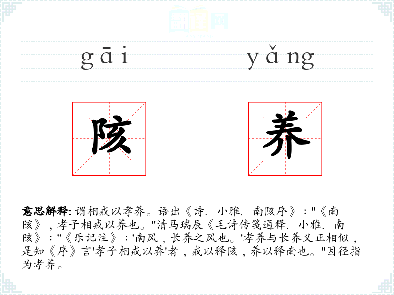 1.谓相戒以孝养。语出《诗.小雅.南陔序》﹕"《南陔》﹐孝子相戒以养也。"清马瑞辰《毛诗传笺通释.小雅.南陔》﹕"《乐记注》﹕'南风﹐长养之风也。'孝养与长养义正相似﹐是知《序》言'孝子相戒以养'者﹐戒以释陔﹐养以释南也。"因径指为孝养。