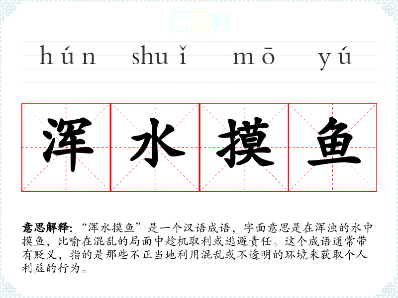“浑水摸鱼”是一个汉语成语,字面意思是在浑浊的水中摸鱼,比喻在混乱的局面中趁机取利或逃避责任。这个成语通常带有贬义,指的是那些不正当地利用混乱或不透明的环境来获取个人利益的行为。