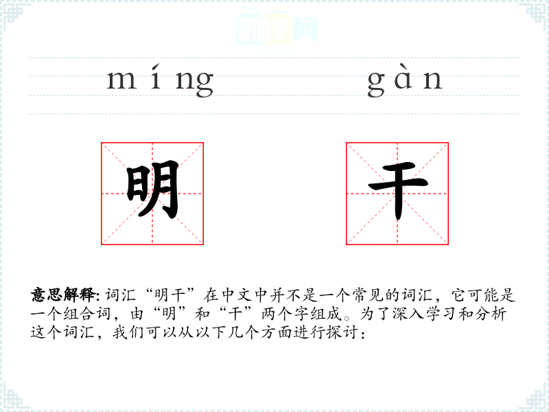 由于“明干”不是一个常用词汇,它在不同语境下的使用并不广泛。如果强行解释,可以理解为“明确地做事”或“干练而明白”的意思。