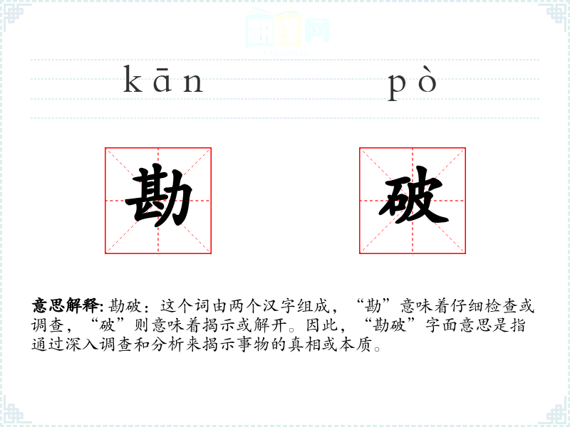 勘破:这个词由两个汉字组成,“勘”意味着仔细检查或调查,“破”则意味着揭示或解开。因此,“勘破”字面意思是指通过深入调查和分析来揭示事物的真相或本质。