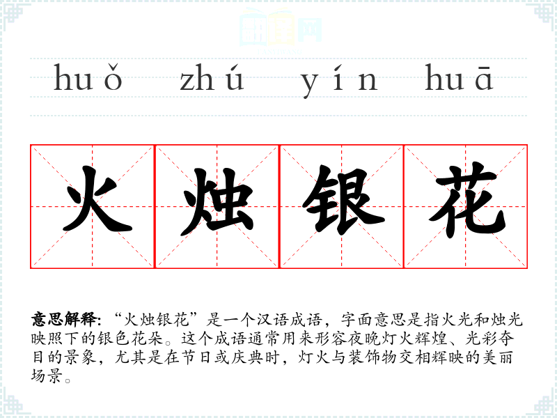 “火烛银花”是一个汉语成语,字面意思是指火光和烛光映照下的银色花朵。这个成语通常用来形容夜晚灯火辉煌、光彩夺目的景象,尤其是在节日或庆典时,灯火与装饰物交相辉映的美丽场景。
