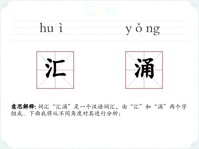 词汇“汇涌”是一个汉语词汇,由“汇”和“涌”两个字组成。下面我将从不同角度对其进行分析: