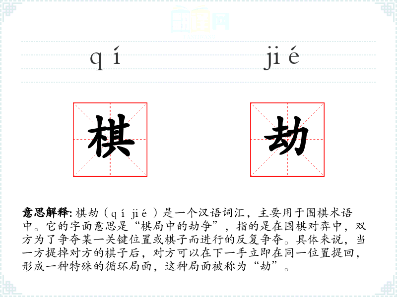 棋劫(qí jié)是一个汉语词汇,主要用于围棋术语中。它的字面意思是“棋局中的劫争”,指的是在围棋对弈中,双方为了争夺某一关键位置或棋子而进行的反复争夺。具体来说,当一方提掉对方的棋子后,对方可以在下一手立即在同一位置提回,形成一种特殊的循环局面,这种局面被称为“劫”。