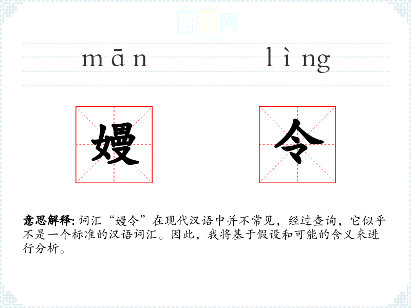 词汇“嫚令”在现代汉语中并不常见,经过查询,它似乎不是一个标准的汉语词汇。因此,我将基于假设和可能的含义来进行分析。