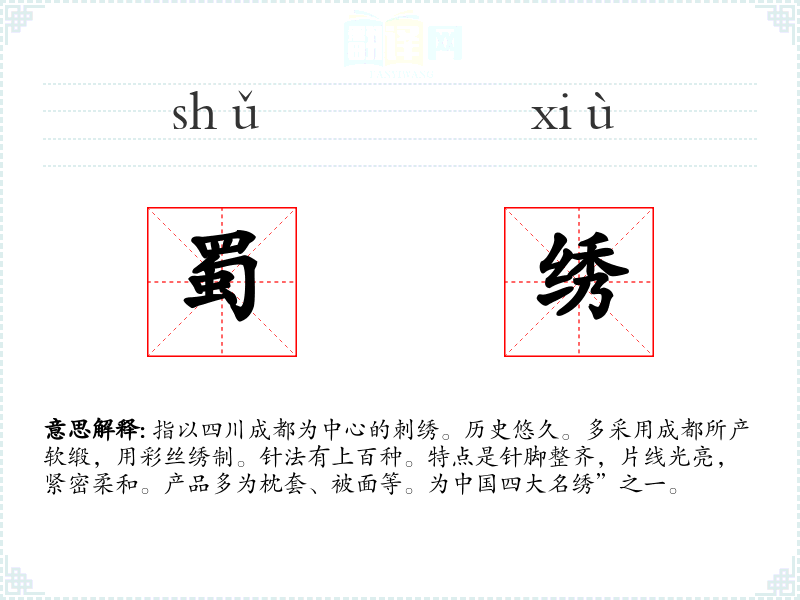 指以四川成都为中心的刺绣。历史悠久。多采用成都所产软缎,用彩丝绣制。针法有上百种。特点是针脚整齐,片线光亮,紧密柔和。产品多为枕套、被面等。为中国四大名绣”之一。