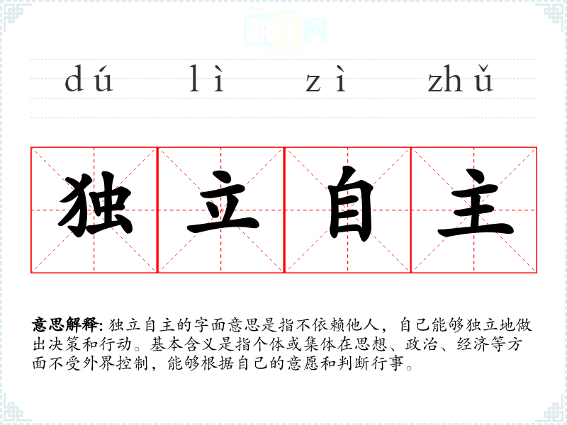 独立自主的字面意思是指不依赖他人,自己能够独立地做出决策和行动。基本含义是指个体或集体在思想、政治、经济等方面不受外界控制,能够根据自己的意愿和判断行事。