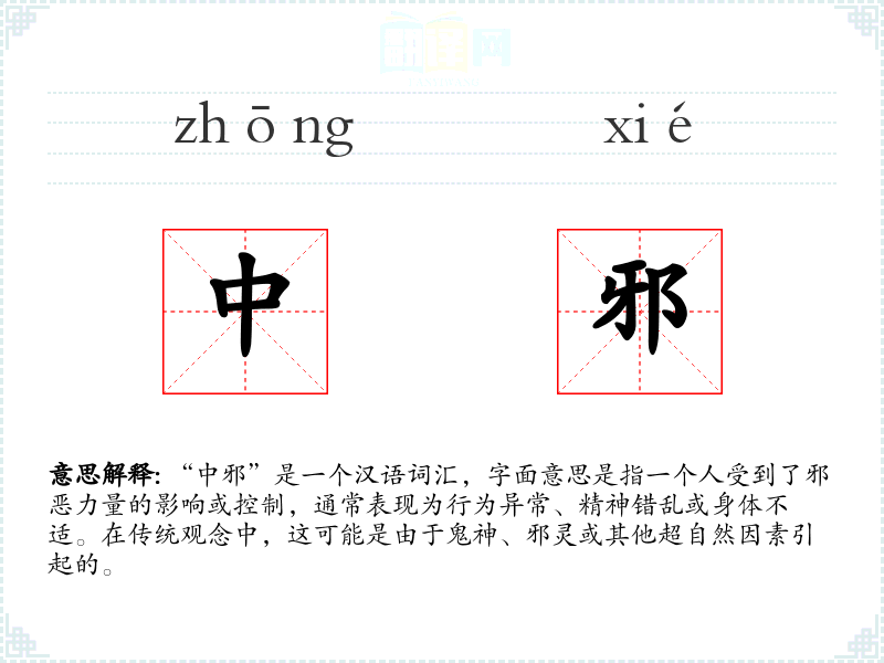 “中邪”是一个汉语词汇,字面意思是指一个人受到了邪恶力量的影响或控制,通常表现为行为异常、精神错乱或身体不适。在传统观念中,这可能是由于鬼神、邪灵或其他超自然因素引起的。