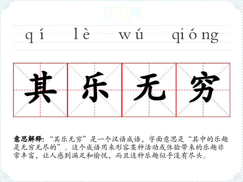 “其乐无穷”是一个汉语成语,字面意思是“其中的乐趣是无穷无尽的”。这个成语用来形容某种活动或体验带来的乐趣非常丰富,让人感到满足和愉悦,而且这种乐趣似乎没有尽头。
