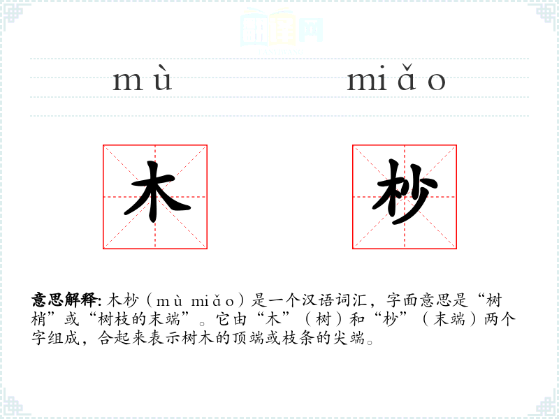 木杪(mù miǎo)是一个汉语词汇,字面意思是“树梢”或“树枝的末端”。它由“木”(树)和“杪”(末端)两个字组成,合起来表示树木的顶端或枝条的尖端。