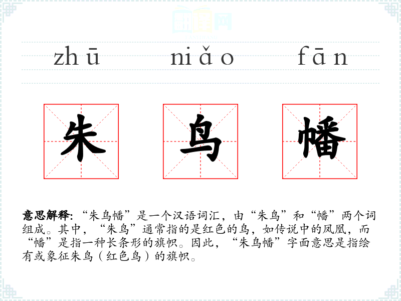 “朱鸟幡”的词源可能与古代的神话和信仰有关。朱鸟作为吉祥的象征,常出现在古代文献和艺术作品中。随着时间的推移,“朱鸟幡”可能从实际的旗帜演变为象征性的文化符号。