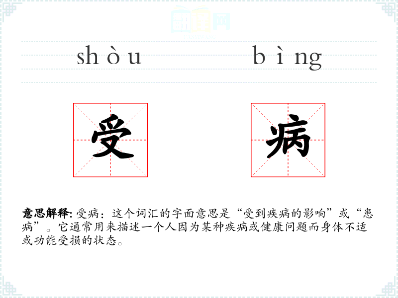 受病:这个词汇的字面意思是“受到疾病的影响”或“患病”。它通常用来描述一个人因为某种疾病或健康问题而身体不适或功能受损的状态。