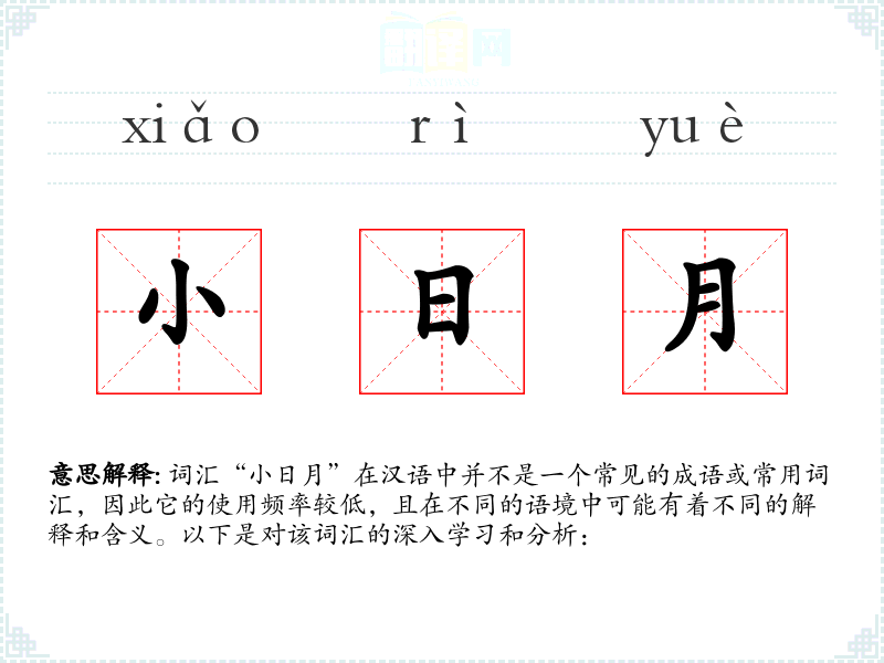 词汇“小日月”在汉语中并不是一个常见的成语或常用词汇,因此它的使用频率较低,且在不同的语境中可能有着不同的解释和含义。以下是对该词汇的深入学习和分析: