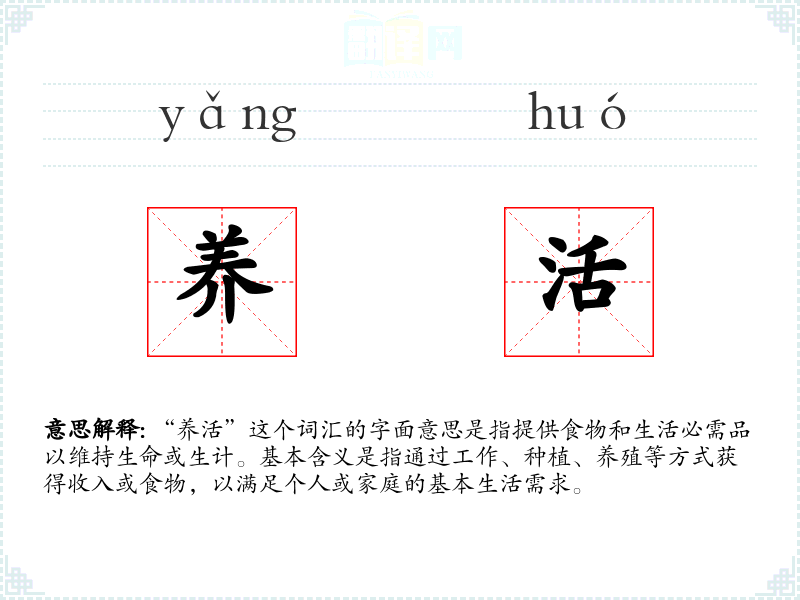 “养活”这个词汇的字面意思是指提供食物和生活必需品以维持生命或生计。基本含义是指通过工作、种植、养殖等方式获得收入或食物,以满足个人或家庭的基本生活需求。