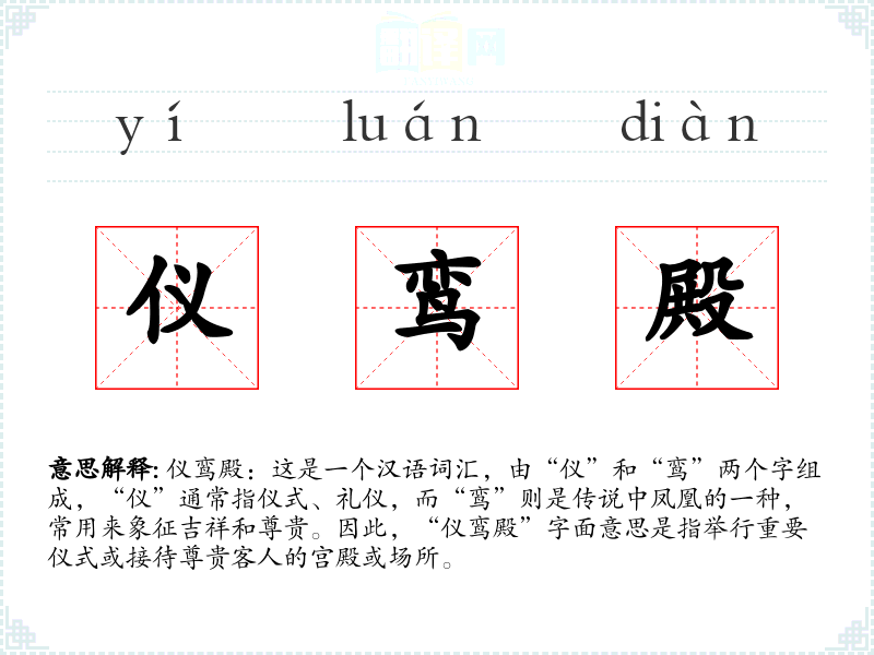 仪鸾殿:这是一个汉语词汇,由“仪”和“鸾”两个字组成,“仪”通常指仪式、礼仪,而“鸾”则是传说中凤凰的一种,常用来象征吉祥和尊贵。因此,“仪鸾殿”字面意思是指举行重要仪式或接待尊贵客人的宫殿或场所。