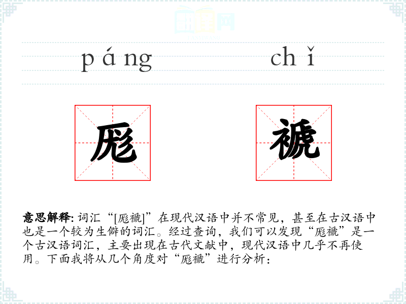 词汇“[厖褫]”在现代汉语中并不常见,甚至在古汉语中也是一个较为生僻的词汇。经过查询,我们可以发现“厖褫”是一个古汉语词汇,主要出现在古代文献中,现代汉语中几乎不再使用。下面我将从几个角度对“厖褫”进行分析: