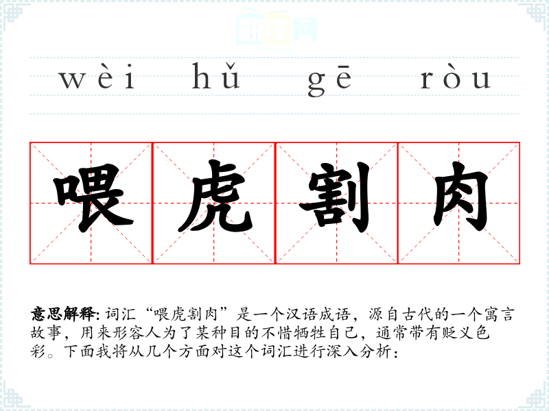 词汇“喂虎割肉”是一个汉语成语,源自古代的一个寓言故事,用来形容人为了某种目的不惜牺牲自己,通常带有贬义色彩。下面我将从几个方面对这个词汇进行深入分析: