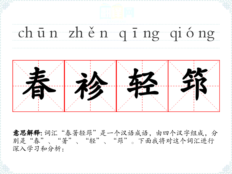 词汇“春箸轻筇”是一个汉语成语,由四个汉字组成,分别是“春”、“箸”、“轻”、“筇”。下面我将对这个词汇进行深入学*和分析: