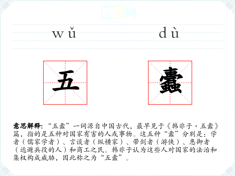 “五蠹”一词源自**古代,最早见于《韩非子·五蠹》篇,指的是五种对国家有害的人或事物。这五种“蠹”分别是:学者(儒家学者)、言谈者(纵横家)、带剑者(游侠)、患御者(逃避兵役的人)和商工之民。韩非子认为这些人对国家的法治和集权构成威胁,因此称之为“五蠹”。