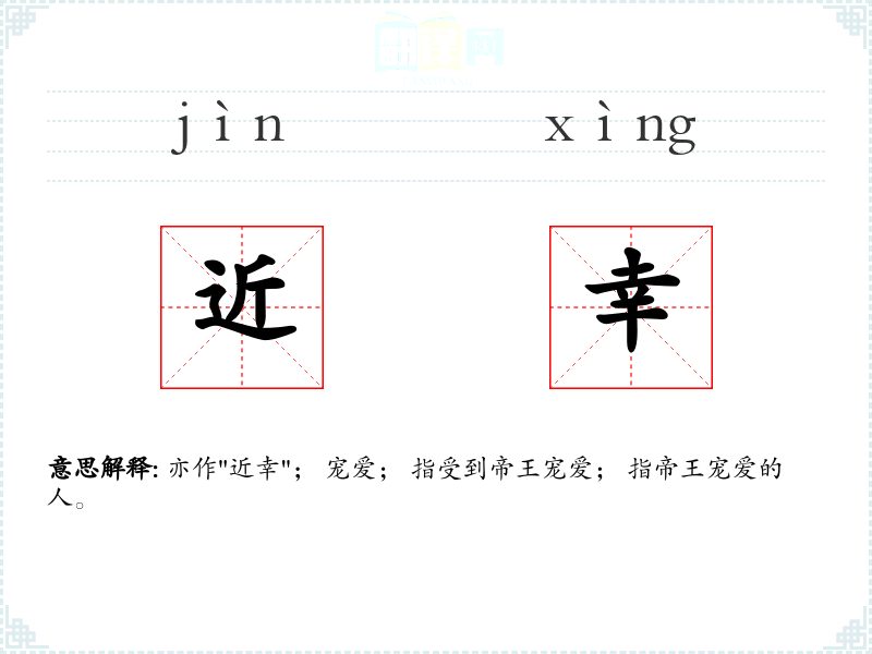 亦作"近幸"; 宠爱; 指受到帝王宠爱; 指帝王宠爱的人。