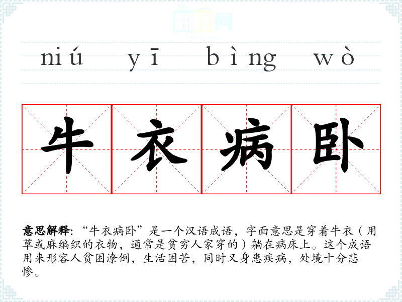 “牛衣病卧”是一个汉语成语,字面意思是穿着牛衣(用草或麻编织的衣物,通常是贫穷人家穿的)躺在病床上。这个成语用来形容人贫困潦倒,生活困苦,同时又身患疾病,处境十分悲惨。