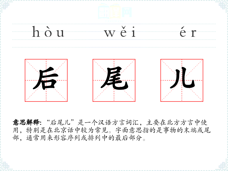 “后尾儿”的词源较为直接,由“后”和“尾”两个字组成,表示后面的尾部。在语言演变中,这个词保持了其基本含义,但在不同的方言中可能有细微的语义变化。