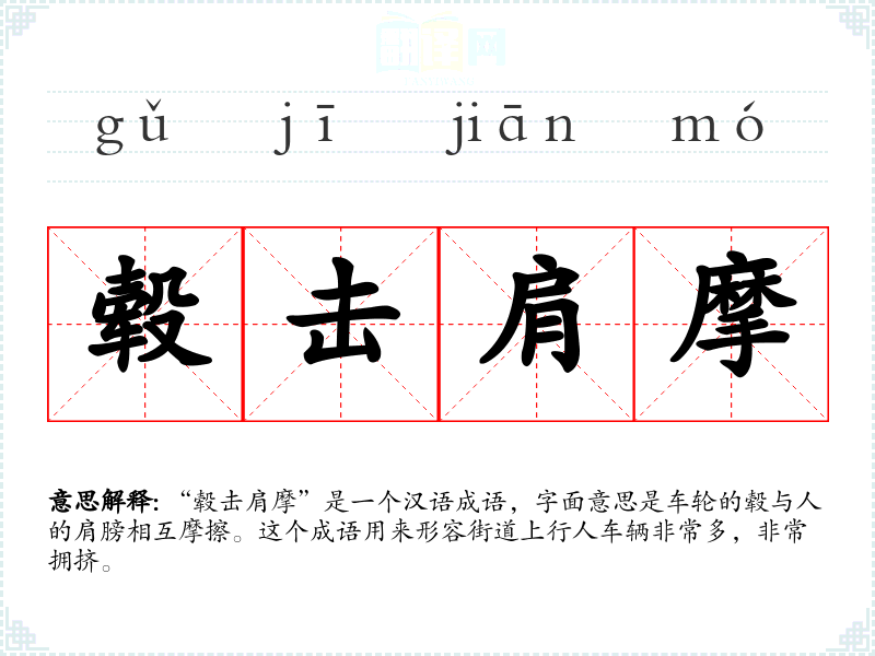 “毂击肩摩”是一个汉语成语,字面意思是车轮的毂与人的肩膀相互摩擦。这个成语用来形容街道上行人车辆非常多,非常拥挤。