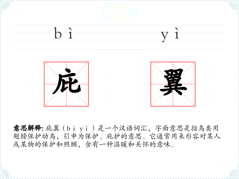 庇翼(bì yì)是一个汉语词汇,字面意思是指鸟类用翅膀保护幼鸟,引申为保护、庇护的意思。它通常用来形容对某人或某物的保护和照顾,含有一种温暖和关怀的意味。