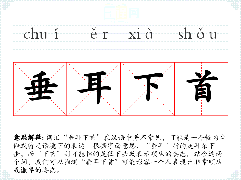 “垂耳下首”字面意思是指耳朵下垂,头低下,通常用来形容人表现出极度的谦卑或顺从。