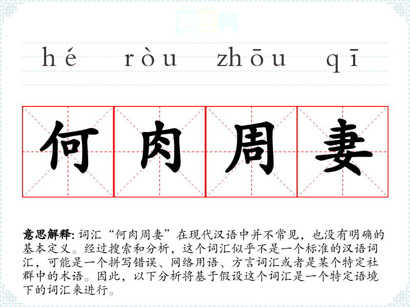 词汇“何肉周妻”在现代汉语中并不常见,也没有明确的基本定义。经过搜索和分析,这个词汇似乎不是一个标准的汉语词汇,可能是一个拼写错误、网络用语、方言词汇或者是某个特定社群中的术语。因此,以下分析将基于假设这个词汇是一个特定语境下的词汇来进行。