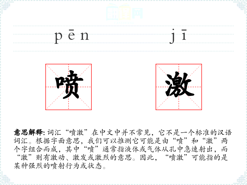 词汇“喷激”在中文中并不常见,它不是一个标准的汉语词汇。根据字面意思,我们可以推测它可能是由“喷”和“激”两个字组合而成,其中“喷”通常指液体或气体从孔中急速射出,而“激”则有激动、激发或激烈的意思。因此,“喷激”可能指的是某种强烈的喷射行为或状态。