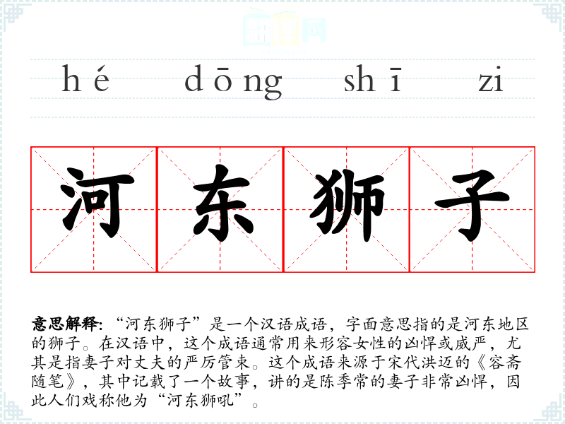 “河东狮子”是一个汉语成语,字面意思指的是河东地区的狮子。在汉语中,这个成语通常用来形容女性的凶悍或威严,尤其是指妻子对丈夫的严厉管束。这个成语来源于宋代洪迈的《容斋随笔》,其中记载了一个故事,讲的是陈季常的妻子非常凶悍,因此人们戏称他为“河东狮吼”。