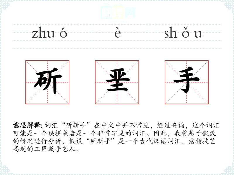 词汇“斫斩手”在中文中并不常见,经过查询,这个词汇可能是一个误拼或者是一个非常罕见的词汇。因此,我将基于假设的情况进行分析,假设“斫斩手”是一个古代汉语词汇,意指技艺高超的工匠或手艺人。