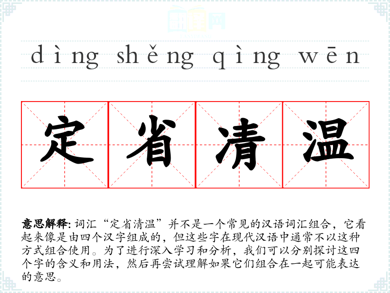词汇“定省清温”并不是一个常见的汉语词汇组合,它看起来像是由四个汉字组成的,但这些字在现代汉语中通常不以这种方式组合使用。为了进行深入学*和分析,我们可以分别探讨这四个字的含义和用法,然后再尝试理解如果它们组合在一起可能表达的意思。