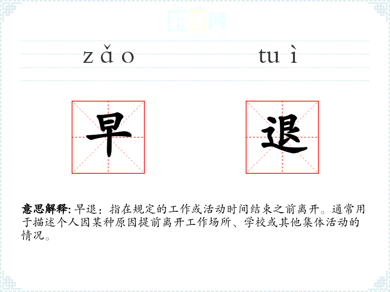 早退一词由“早”和“退”两个字组成。在古代汉语中,“早”表示时间上的提前,“退”表示离开或返回。随着时间的推移,这两个字结合在一起,形成了现代汉语中的“早退”一词。
