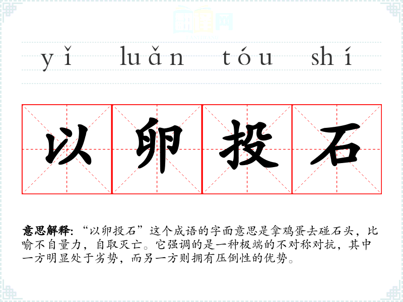 “以卵投石”这个成语的字面意思是拿鸡蛋去碰石头,比喻不自量力,自取灭亡。它强调的是一种极端的不对称对抗,其中一方明显处于劣势,而另一方则拥有压倒性的优势。