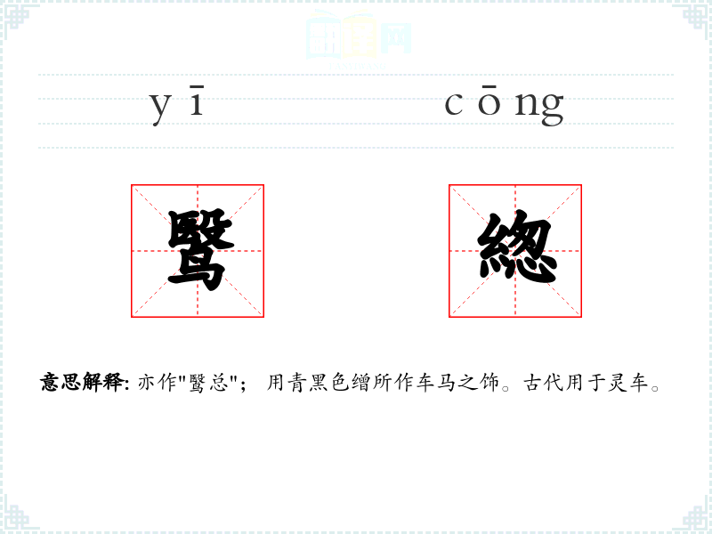 亦作"鹥总"; 用青黑色缯所作车马之饰。古代用于灵车。